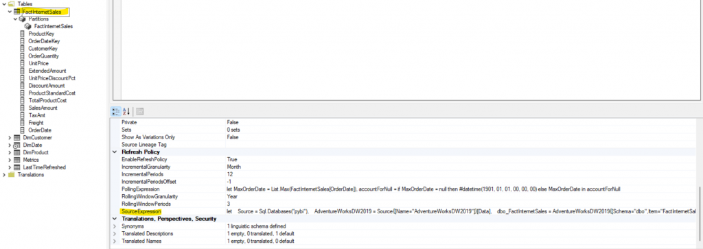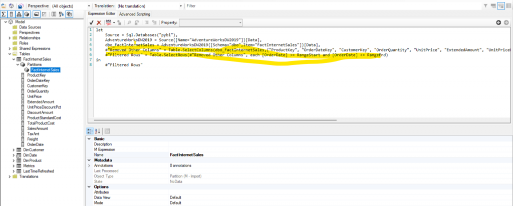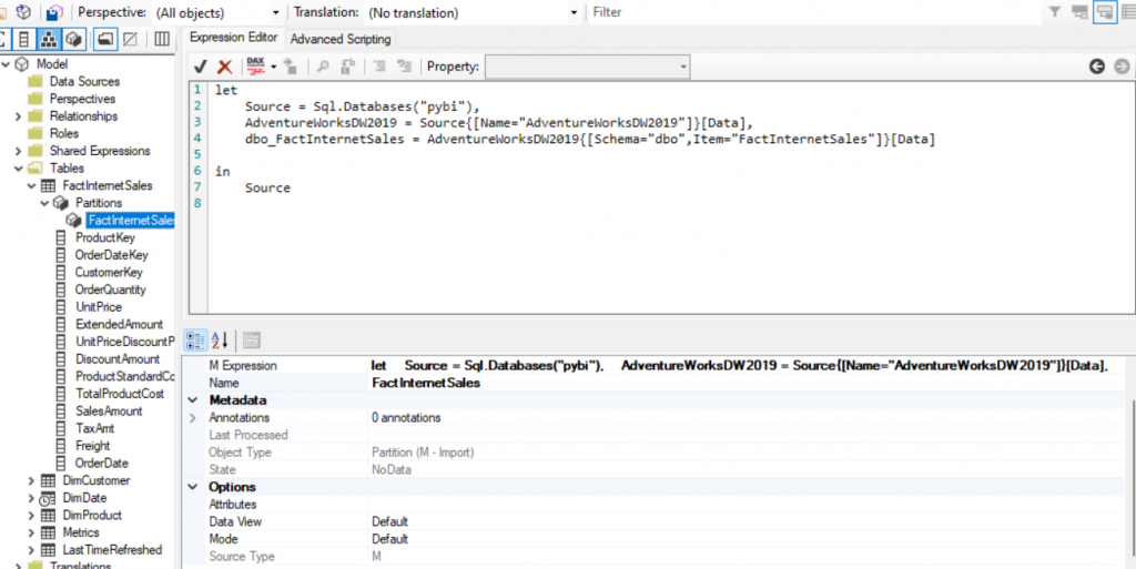 Let’s move to next step. Select the FactInternetSales and lets dig in the source expression in Tabular Editor.