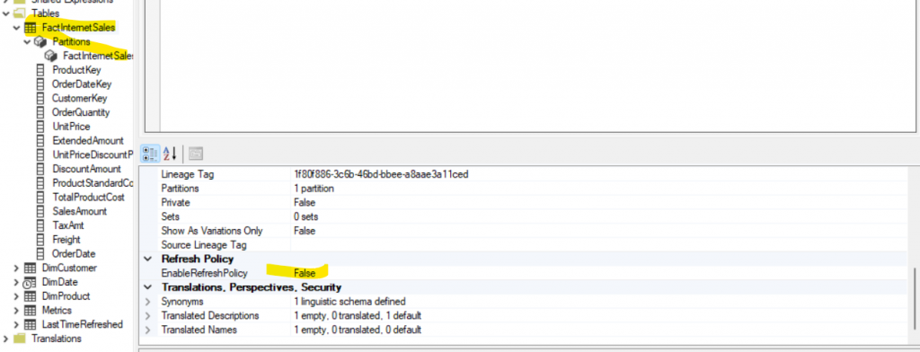 Select FactInternetSales and go to properties then Refresh Policy then Turn EnableRefreshPolicy to False